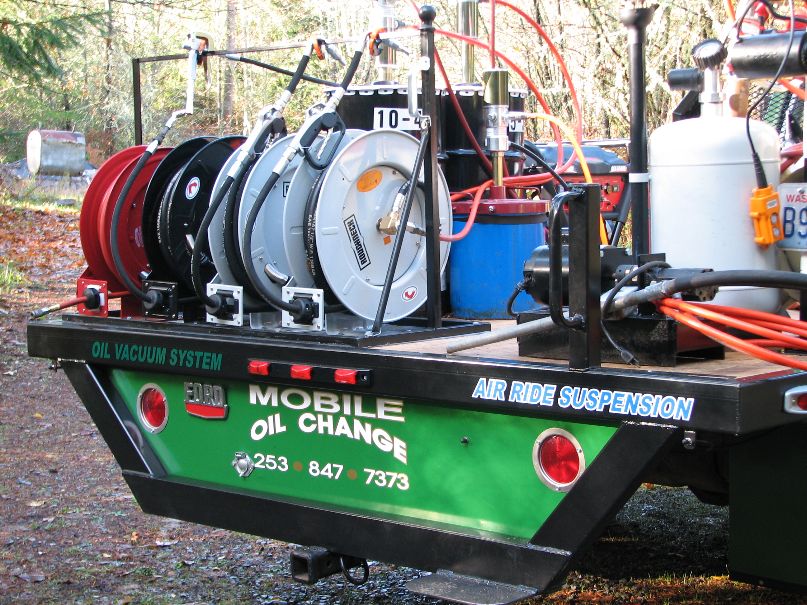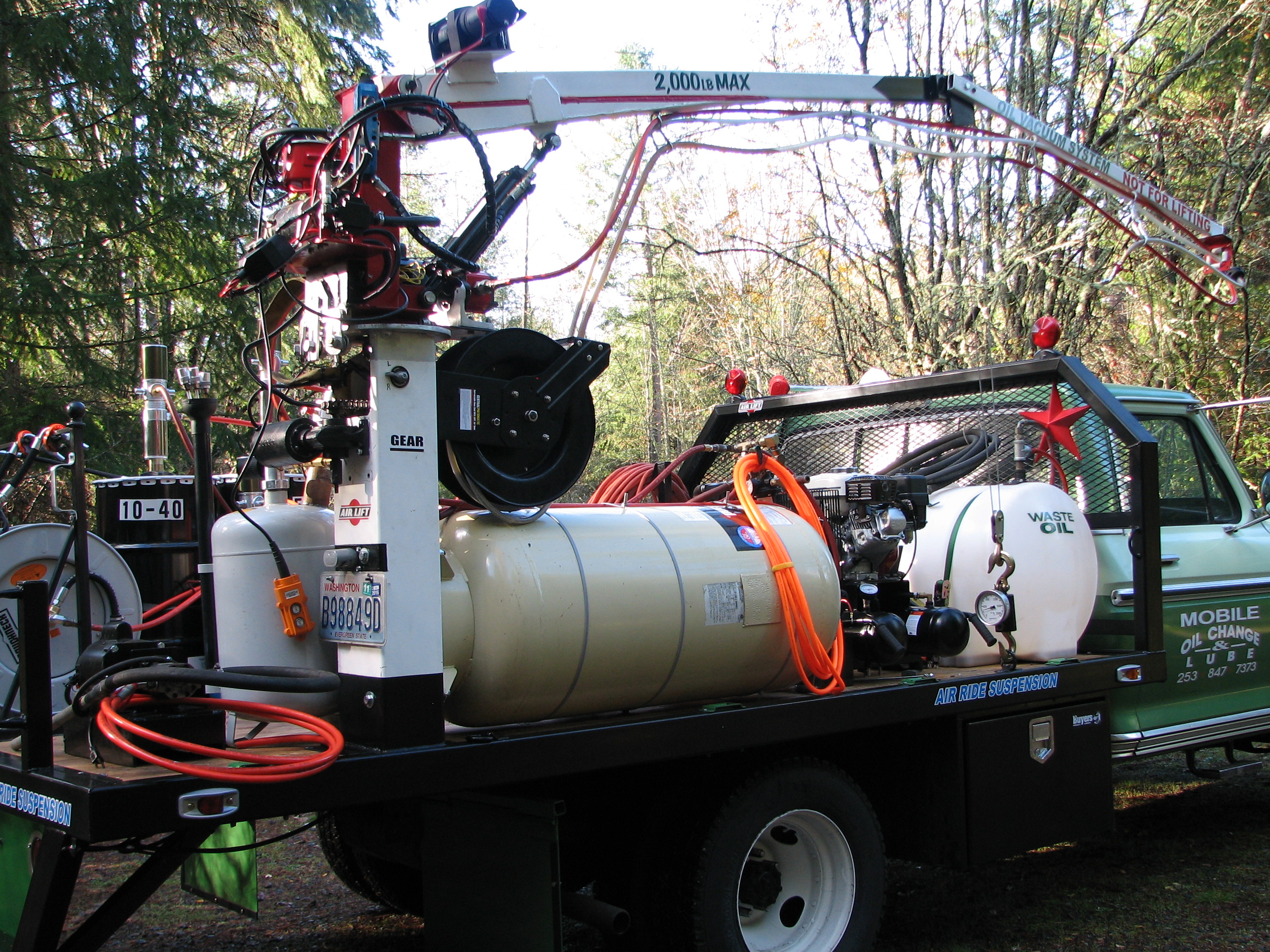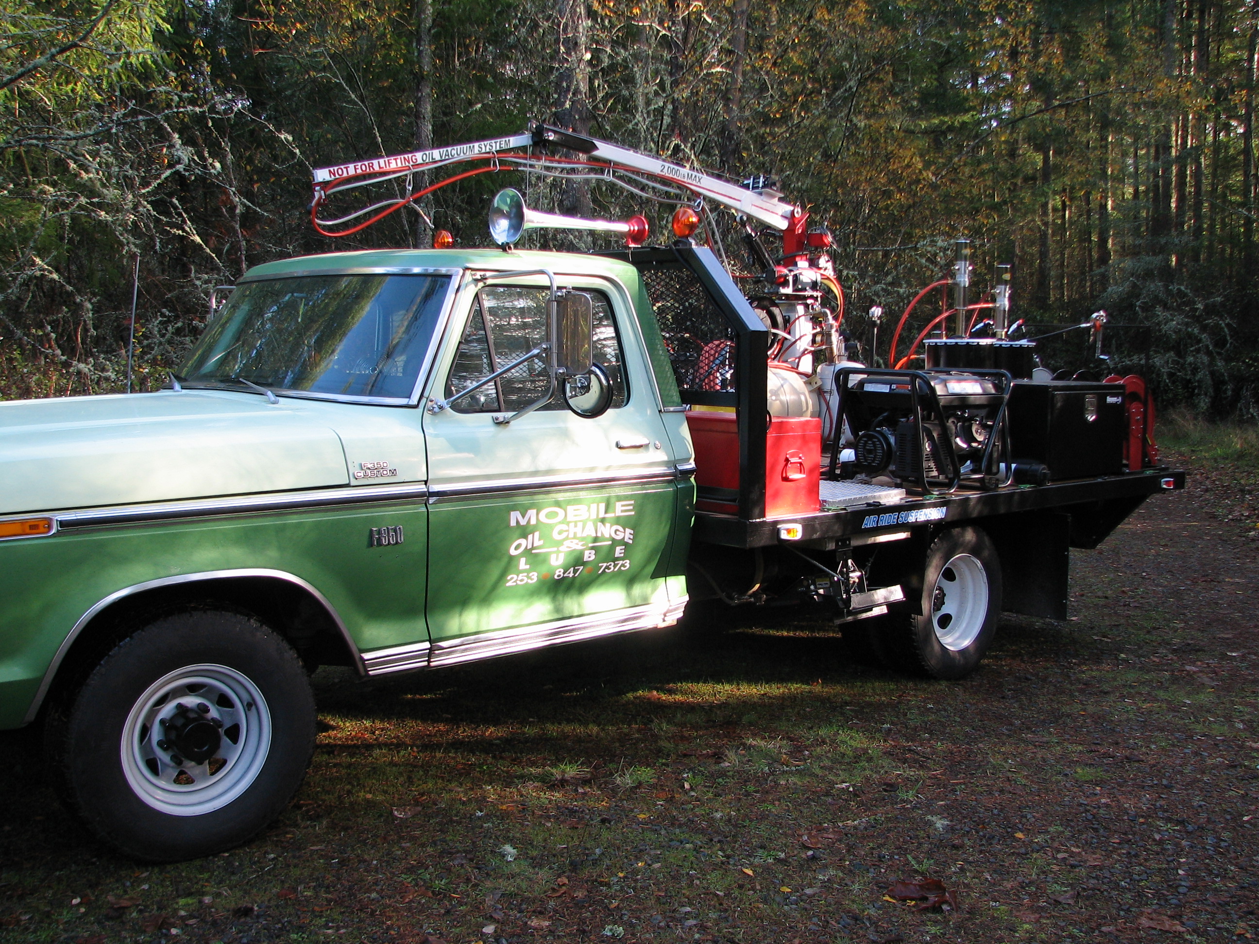 We have a 'state of the art' vacuum system having 12 different probes that will fit down the dipstick tubes. One for most any car, truck or equipment. We then vacuum the oil out which goes to a 'waste oil tank', never spilling a drop of oil. We change your oil with CHEVRON oil, new filter, and lube the front end of your vehicle. All fluids are inspected including radiator, battery, charging system, power steering, check brakes, tire pressure and then do a diagnostic scan to let you know if your vehicle needs any mechanical work. Note: we do not do any mechanical work. The charge is only $39.95 plus tax for this service if your vehicle is located within a 12 mile radius. We can go farther out for two or more vehicles. For large trucks and heavy equipment the charge is $50.00 hour plus oil and filters. The nice thing is you don't have to leave your home or place of business....